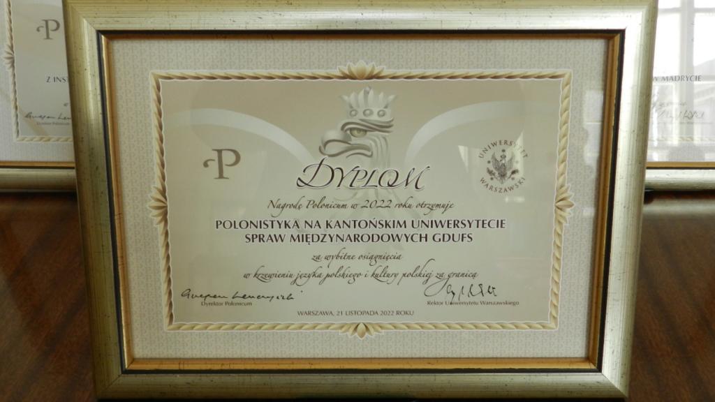 The certificate of the “POLONICUM Award” to the GDUFS