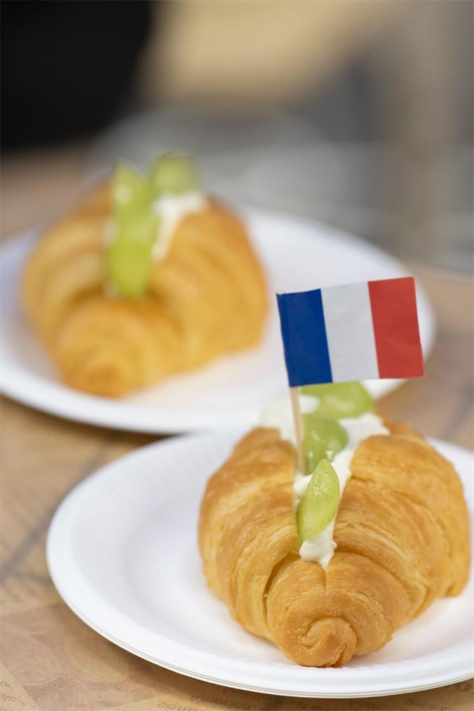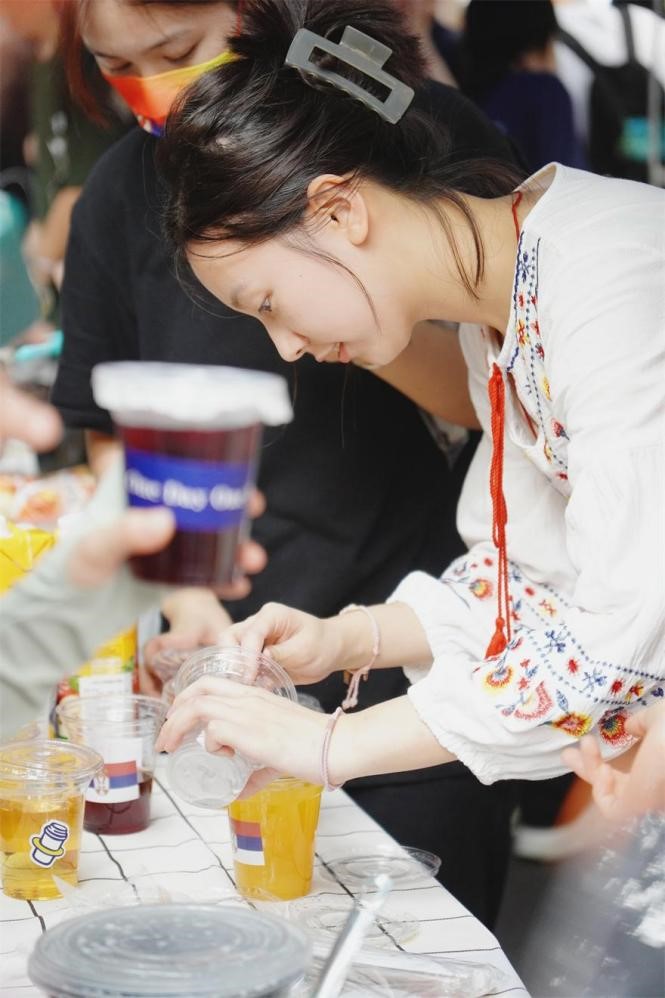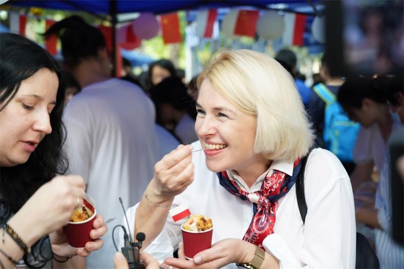 Both sides of the school road were filled with various European delicacies prepared by students, which were visually and aromatically appealing. There were not only traditional Russian leba and red sausage, Italian tiramisu and sparkling wine, but also French caramel pudding and parfait, and so on. Teachers and students from different language departments displayed their culinary skills without any reservation. The school road was filled with attractive fragrances and cheerful laughter.