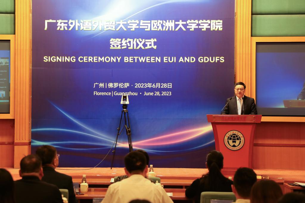 On June 28th, the signing ceremony of the comprehensive cooperation framework agreement between GDUFS and the European University Institute (EUI) was held at the International Conference Hall of Baiyun Mountain Campus. The speech was delivered by Shi Youqi, President of GDUFS.