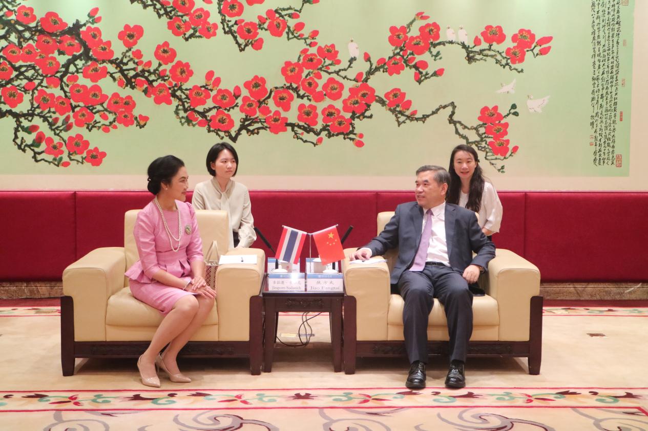 On September 14, Jiraporn Sudanich, Consul General of the Royal Thai Consulate General in Guangzhou, and her entourage visited Guangdong University of Foreign Studies (GDUFS). Jiao Fangtai, Vice President of GDUFS, met with the guests in the VIP Hall of the Administration Building of Baiyunshan Campus. The two sides exchanged views on subject construction, talent training, cultural exchanges, and other matters.