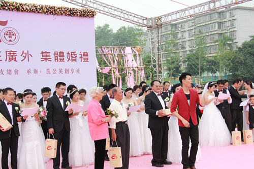 The whole wedding consists of three parts: taking the bride from her “family”, the western wedding ceremony and the wedding feast. They respectively took place at the 13th Dormitory Building, on the playground and, lastly, at the Yilin Hotel. As a distinctive part of the GDUFS 50th Anniversary program, this activity attracted fifty couples who are GDUFS alumnus to participate. They came back to their old school, enjoying the special wedding and recalling their memories of GDUFS. The couples returned to GDUFS from over 60 regions of the world, among which there were not only the oldest alumnus who entered GDUFS since its establishment but also those who had just graduated.