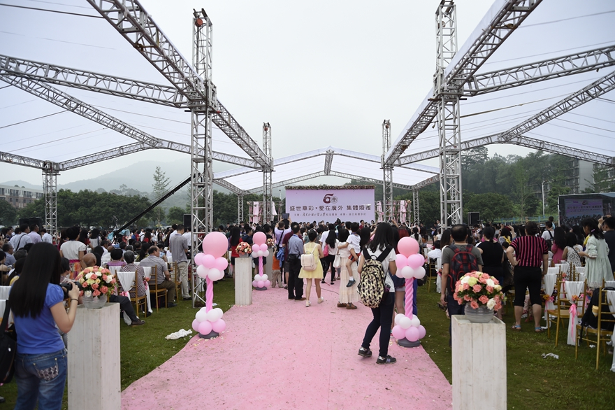 The non-profit group wedding was hosted by the GDUFS Alumnus Association and was organized by the Dandelion Creation and Sharing Community. With great passion for GDUFS 50th anniversary, students had racked their brains to invent creative ways of having a wedding for about half a year. They got everything ready including recruiting volunteers, bridesmaid, groomsmen and other resources. On the wedding, volunteers dressed in red T-shirts could be seen everywhere. Bridesmaids and groomsmen also spared no effort to assist the brides and bridegrooms. Thanks to their dedication, the wedding was well-organized and well-received.