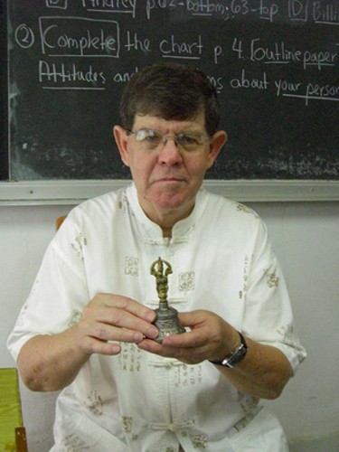 His class is always amusing and interesting, partially, he thinks, because of his personality, and partially because of his teaching philosophy. He is active and full of expressions during the class. Those students who have been taught by him will never forget his little bell, which he bought in Hong Kong and brings to all his classes. "I use it for practical purposes. You just have to hit the bell lightly to catch the attention of the students without raising your voice." Students find it quite special and enjoy it very much.