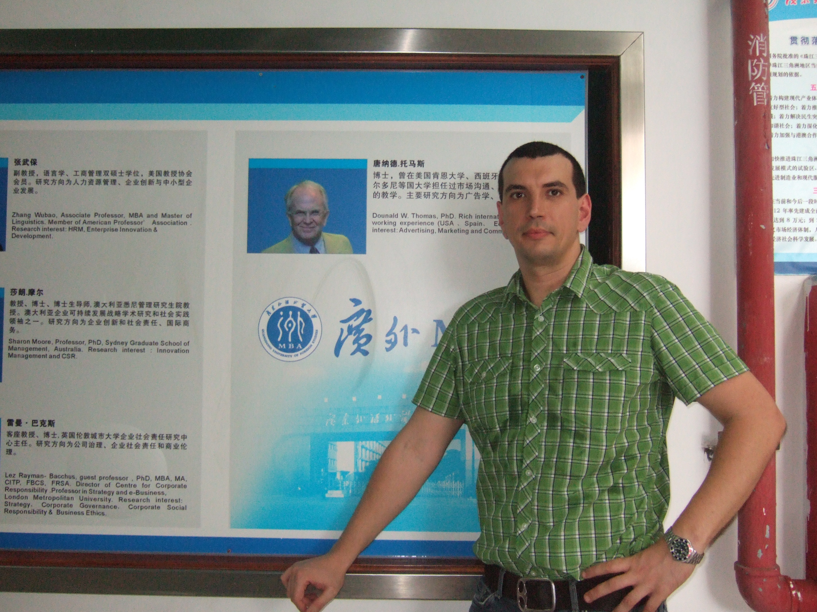 July 5 -If one looks back to the days of explorers such as Christopher Columbus, it can be said that historically, Europeans have a taste for adventure. Aitor Robles Prado, a Spanish man, is no exception. He came to China three years ago with his wife, who had been given work in China. Aitor added that he came to China for a change of pace, looking for a fresh experience in this eastern country. Now Aitor works in Weiss-Rohlig Hong Kong Ltd., and comes to GDUFS to receive his MBA education on the weekends.