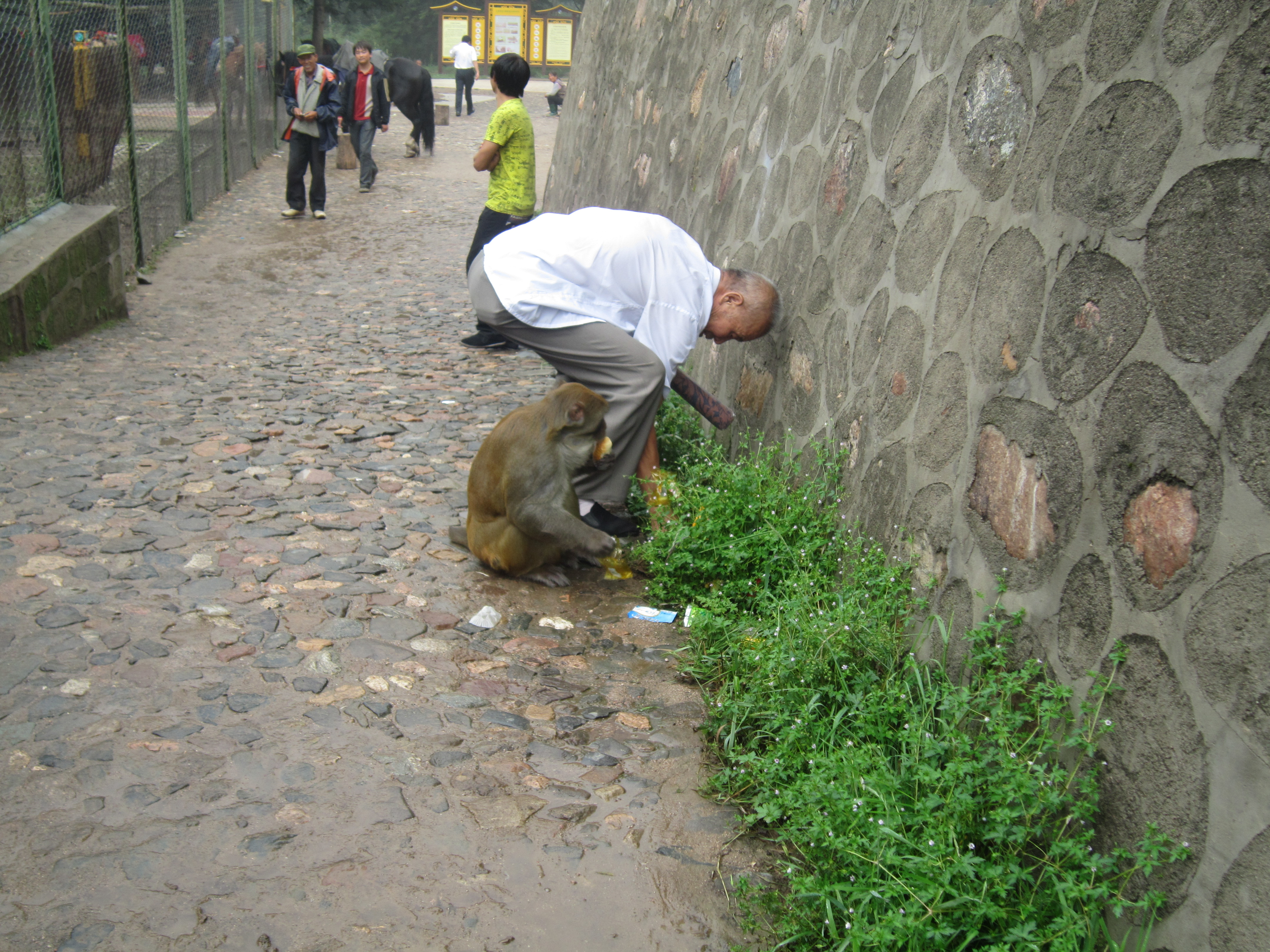 We set out from Taiyuan early in the morning. It took us three hours to get there. Four wild monkeys welcomed us at the gate. We had been warned that the monkeys grab tourists, but my naughty little brother Michael didn?t listen, and he took a bag of packed snacks with him. Several monkeys were on the move at their first sight of Michael, or to be more exact, the plastic bag in his hand. One of the oldest monkeys slid close to Michael, ripped the plastic bag, grabbed some snacks and rushed back up to the tree. When we finally realized what had happened, the monkey had opened the package and ate all the snacks.