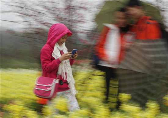 Walking with light steps among the blooming flowers, a girl in red is recording the scenes of early spring with her cell phone.