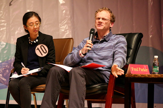 The Dialogue Interpreting had invited four distinguished guests, who were XING Jie, teacher from SITS, LI Jiayong, teacher from the School of Legal Studies, Stephen Rake and Fred Parker, both foreign teachers. The contestants debate centered on two topics: favorable circumstances vs. adverse situations in life and who is charged for the generation gap.