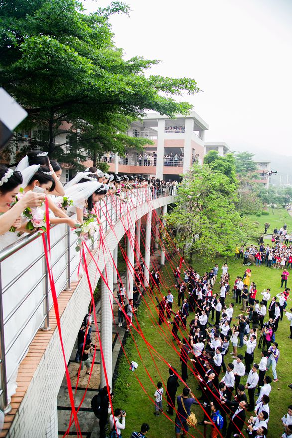 At the last part of the ceremony, the brides and the bridesmaid went downstairs, meanwhile the bridegrooms and the groomsmen moved to the gate of the students’ dormitory. In good order, the bridegrooms went to their wives, hugging or kissing and taking photos. Some bridegrooms even took their kids to meet their mother, which was really a lovely scene. One after another couples were escorted with people’s teary eyes and best wishes.
