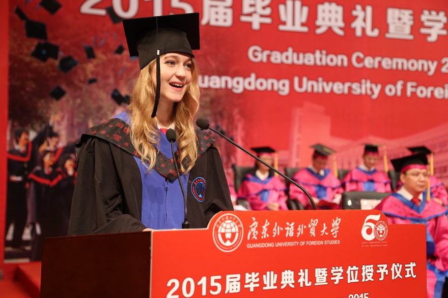 Majoring in Chinese for International Business, the international student representative from Russia described the story about her days at GDUFS, in fluent and funny but genuine Chinese, which triggered rounds and rounds of applause. She said, “Thank the teachers and friends who have given me their hands. I’ll keep the school motto in mind and keep going on.”