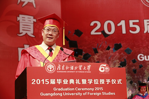 The 2015 GDUFS graduation ceremony was unveiled at the Yunshan Hall of the North Campus and the Great Hall of the South Campus sequentially. There were seven sessions in all according to the departments, centers or institutions. The first one was held for the Center for Foreign Culture, the Center for Art, the Institute for International Education, the School of English for International Business and the Faculty of European Languages and Culture. Those attending included GDUFS Party Secretary CHEN Jianping, Vice-Presidents LIU Jianda and LIU Haichun, and the delegations of tutors, alumni and parents of the graduates. The first graduation ceremony was hosted by LIU Jianda.