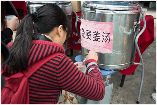 Because of the cold weather, hot ginger decoction was prepared for the students who had to wait for several hours in the shivery breeze, to warm their body and heart.