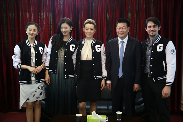 At 2:30 pm, ZHONG Weihe, the President of GDUFS, welcomed the film crew warmly in the VIP lounge of Yunshan Hall, presenting four sets of baseball uniforms to them, which were designed for the GDUFS 50th anniversary. On hearing that 2015 is the GDUFS 50th anniversary, the guests felt so surprised, presented their best wishes and immediately donned the gift attire to take a picture with President Zhong.