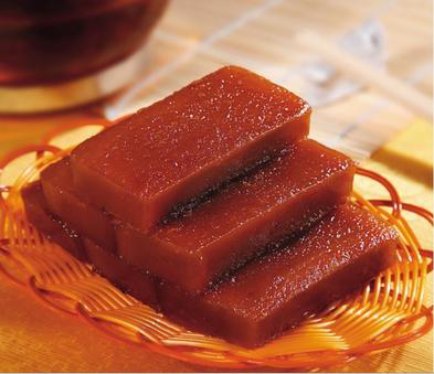 Nian Gao, which translates as "New Year Cake", plays a more important part than dumplings in southern China. Nian Gao is a sweet, sticky, brown cake made from glutinous rice flour and brown sugar. After steaming over a high heat and cooling down, it is cut up into rectangles to have a pure taste of flexibility and chewiness. Made from simple material, Nian Gao can be prepared in a number of different ways such as steamed, fried, fried with eggs or even eaten cold. In Guangdong and Hong Kong, people usually add ginger juice or red dates to make Nian Gao more distinctive with delicate flavor.
