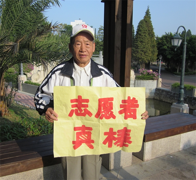 In 2010, the worldly grand gathering for the Asian Games was held in Guangzhou, which gave Cheng Fuan an opportunity to utilise his remaining energy. When the energetic young all joined the volunteer teams to give full play of their strengths, Cheng, always enthusiastic about public undertakings, undoubtedly hoped to make some contributions. Actually, he set a good example for the young volunteers and helped them a lot. Before the opening of the Asian Games, he tried to get more knowledge of the history of the Asian Games and learned its whole anthem. Besides, although almost unable to read the letter “A”, he finally remembered 900 useful English sentences which could be helpful during his volunteer work. More admirably, considering the health conditions of the elderly volunteers, the relevant person in charge distributed less and easier work to them. But Cheng still kept getting up early at 5am and staying until 11pm every day, in order to offer spiritual support to the young volunteers.