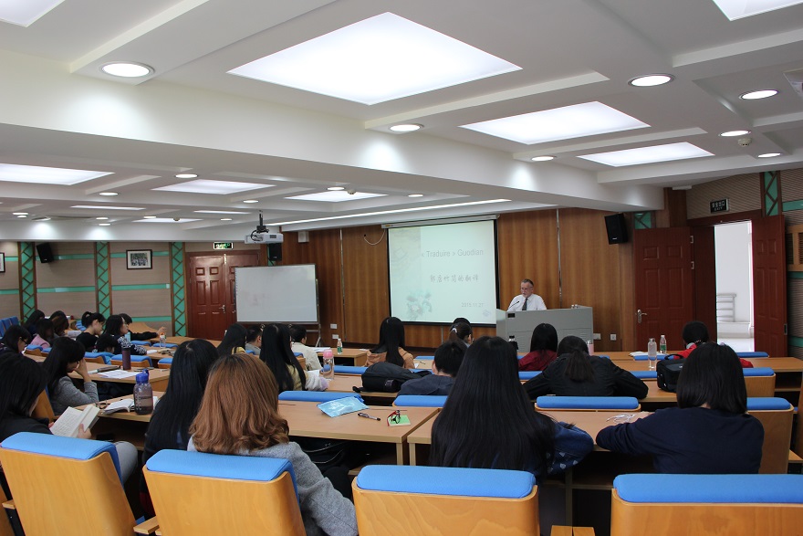 On the afternoon of November 27th , Rémi Mathieu, a famous French sinologist and a senior researcher of the Research Institution of East Asian Culture of CNRS (The French National Center for Scientific Research), visited GDUFS and delivered a speech at the Huanghua Hall in Building Nine, north campus of GDUFS. The topic of his speech was about how to translate the Guodian bamboo slips.