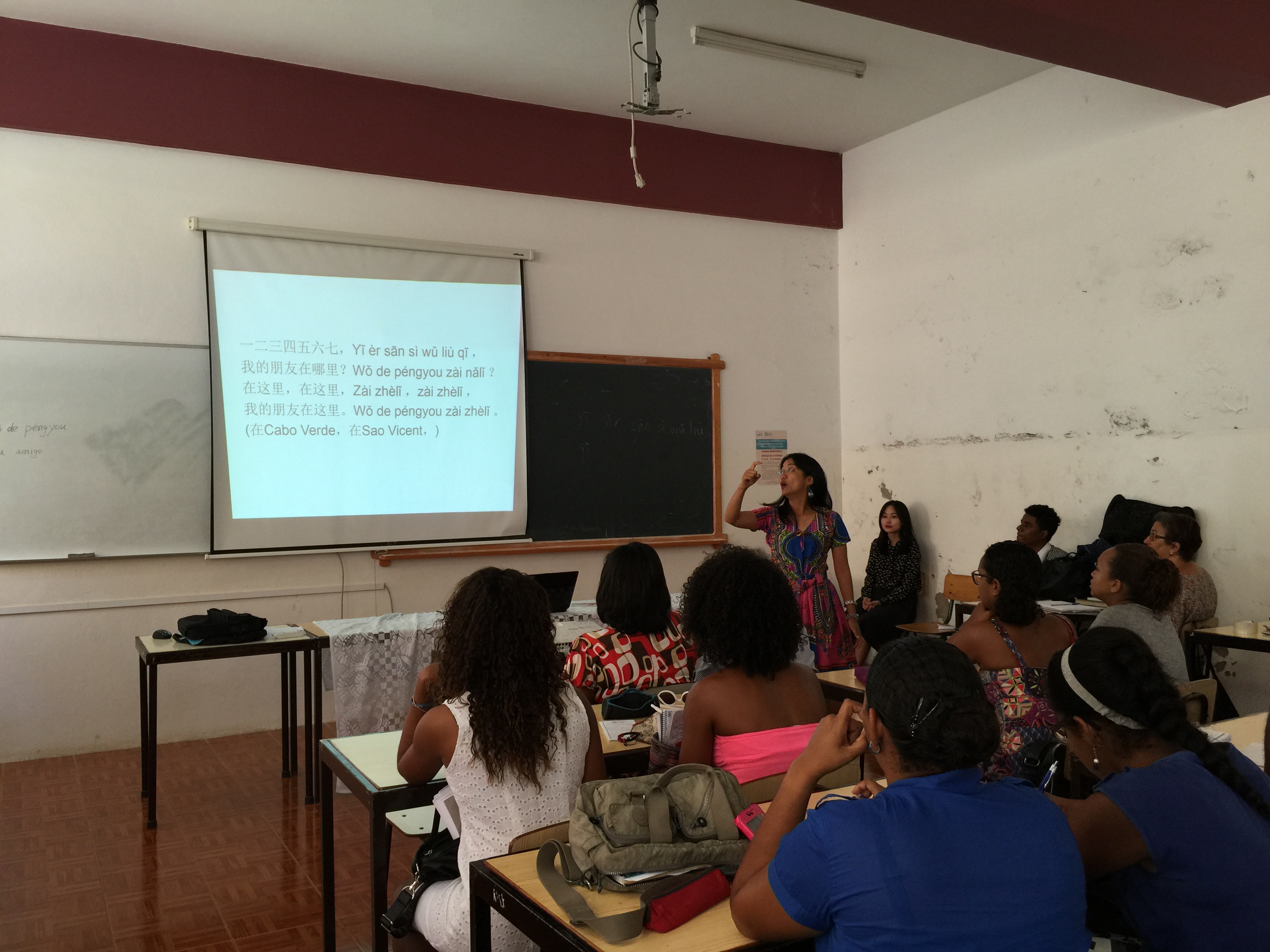 This public lecture consisted of three stages. During the first stage, students were taught about how to greet and introduce themselves in Chinese. They learned how to say some words and sentences such as “hello”, “China” and “Cape Verde” in Chinese.