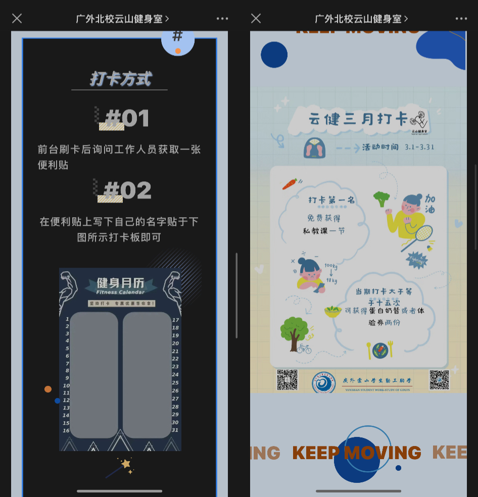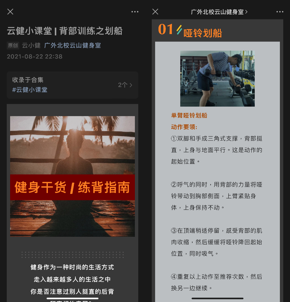 In addition to its offline basic service, Yunshan Fitness Room's official account also regularly releases useful articles, videos, and fitness clocking activities to help promote health and fitness knowledge among its followers.